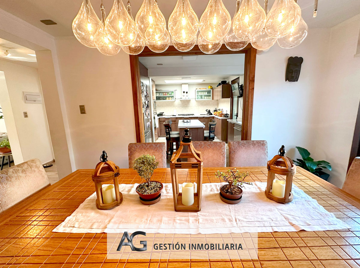 - Hall de ingreso con baño para visitas, sala con salida al patio delantero y comedor de muy buen tamaño (con separador de espacios en madera) con salida al patio trasero, cocina con isla y varios compartimentos, logia con muebles, patio trasero con piscina temperada, césped natural con riego automático y quincho.